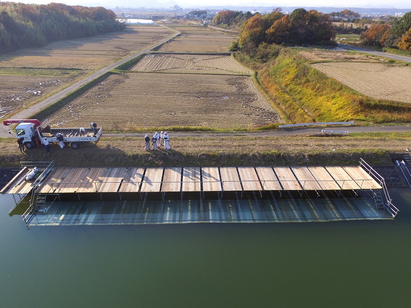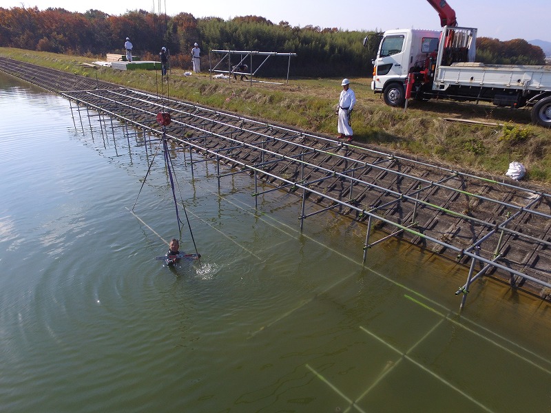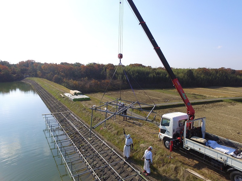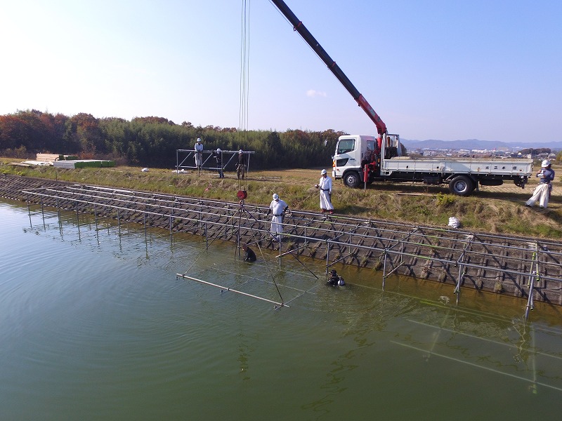 太陽光設置用ステージ、水深20cmの位置にステージ要望にお応えし、図面制作、単管骨組み大組(ユニッククレーンにて)水中潜水士作業空撮業務まで一貫して当社にて施工しています