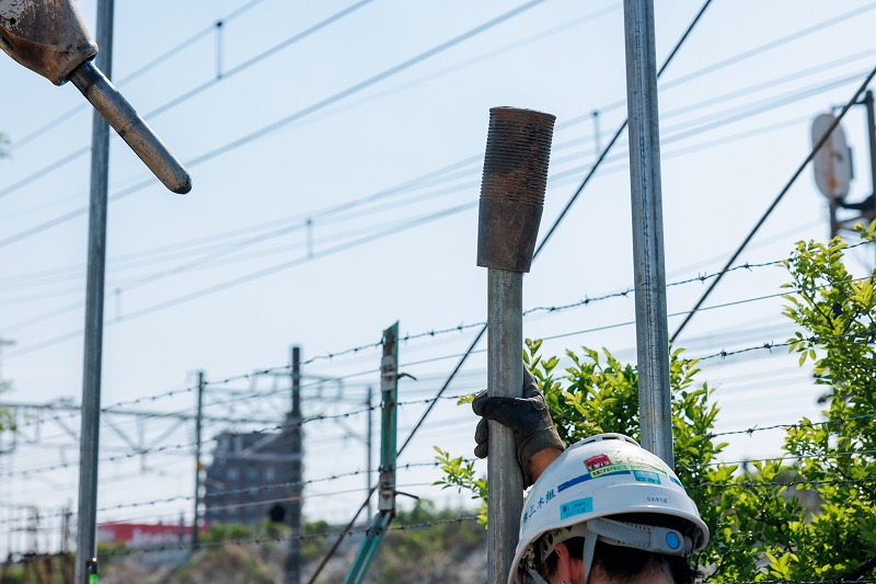 安全面では、単管+アタッチメント装着する際、合番者が単管を持っているが、単管の倒れる長さ、+ α退避してから打撃を加える事により、より安全性が増すと考えられます。